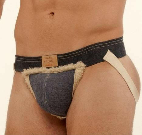 Jockstrap with comfortable fake fur inside and soft jean material outside. Waistband made